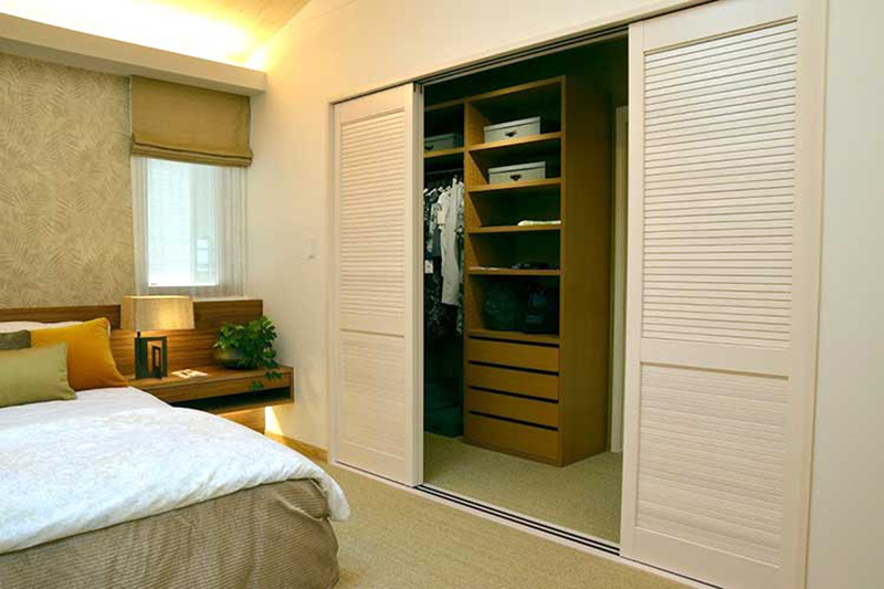 自然と一体になったような静謐な空間です。 寝室ウォークインクローゼットの扉に、ウッドシャッターを使用した寝室。