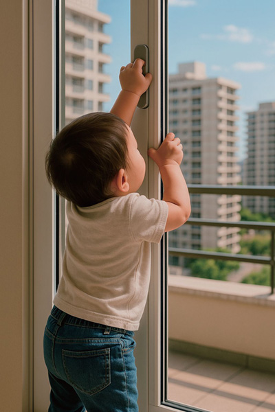 ▲ すぐに開けちゃいます! 『子どもの転落防止に!チャイルドロック付サッシ錠「まもるんるん®」』