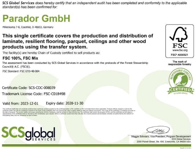 また、ヨーロッパ圏では一般的に、長期使用により生じるキズや凹み、日焼けなどに対して、約15〜20年後を目安に「表面研磨再塗装(サンディング&リフィニッシュ)」を行い、新たな表面を再生することで、さらに長くご使用いただくメンテナンス手法が採用されています。 より良い暮らしの為のエレメントとして、パラドールフローリングを是非ご採用ください。 生産国パラドールフローリング生産は、「品質確保」・「環境配慮」・「安定供給」が確保されたドイツ国Parador社オーストリア工場にて行われています。