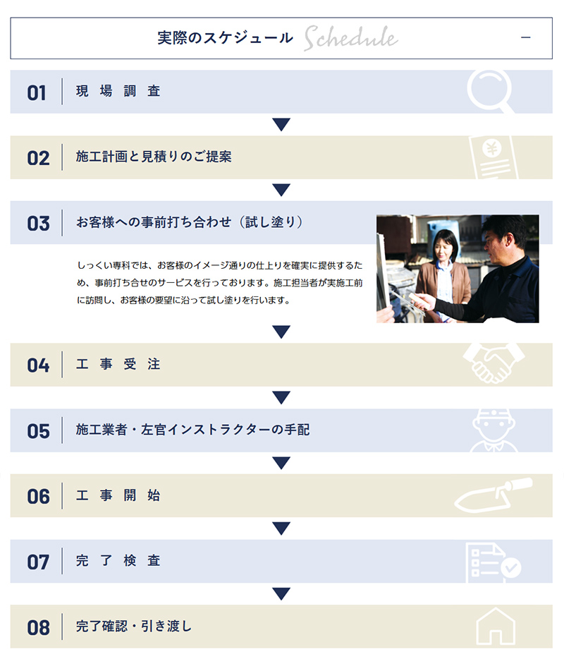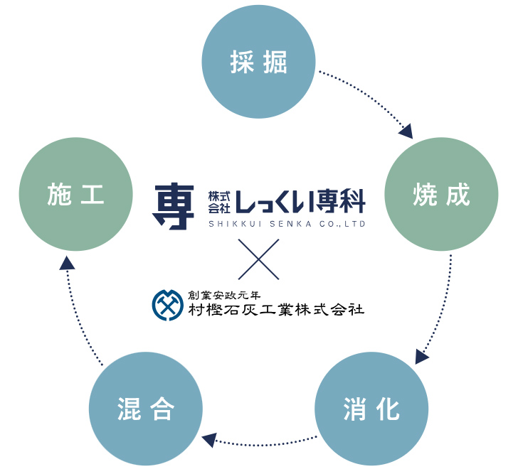 事業の流れ今まで、しっくいを製造する会社と、施工する会社は別会社であることが一般的でしたが、しっくい専科では、材工一括でのスピーディーかつ、信頼性を高めた対応を実践しております。